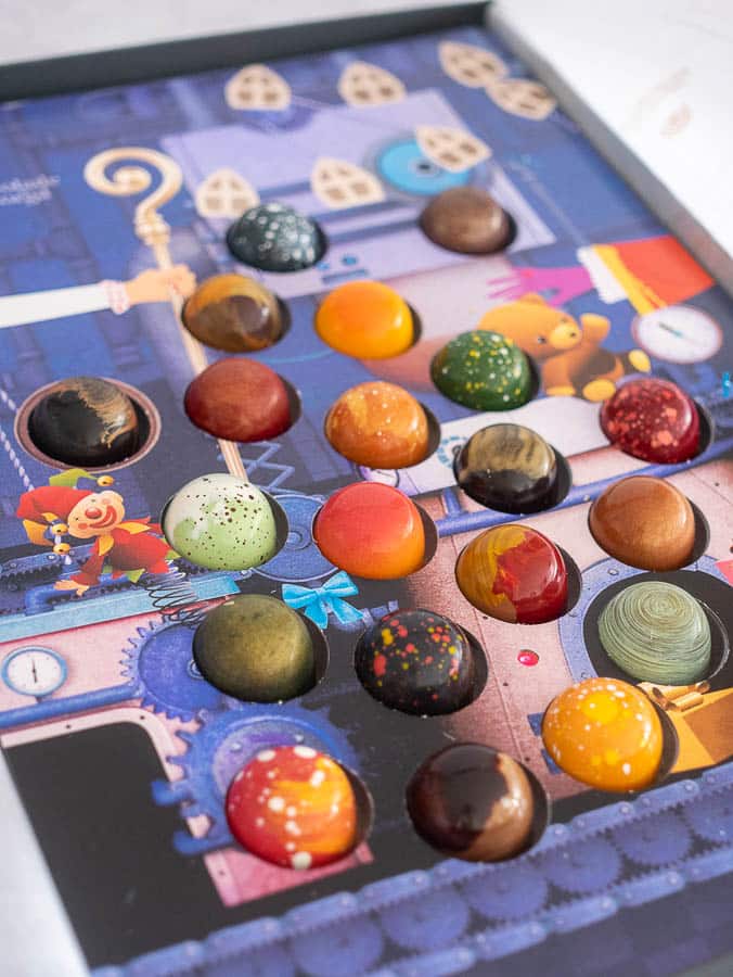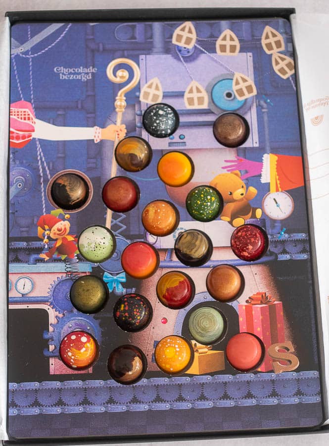 Bij de Sints Chocoladefabriek zitten er in de mooie Sinterklaasverpakking 21 handgemaakte en -beschilderde bonbons. Ik vind het zelf vooral heel leuk dat het kwalitatief echt heerlijke chocolade is, in een prachtige verpakking en eens iets anders dan anders.