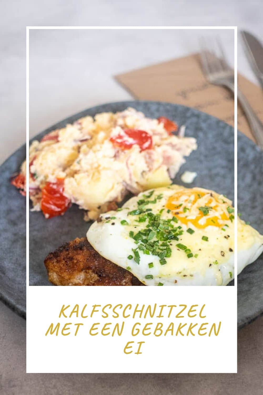 - Breek de eitjes en bak ze in de koekenpan, strooi de geraspte kaas en bieslook er overheen. Zo kan de kaas nog een beetje smelten. Bak de schnitzels rondom mooi goudbruin en knapperig. Kalfsvlees is altijd snel gaar dus ik had 2 hele dunne en die waren met 4 á 5 minuten echt al gaar.